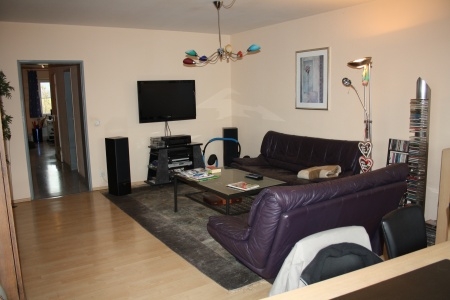 Das gräumige Wohnzimmer ist mit Laminatboden ausgelegt. Von hier betreten Sie durch eine große Flügeltür den großzügigen Balkon, auf dem sich im Sommer herrliche Sonnenabende genießen lassen. Die Küche ist klein und als offene Küche an das Wohnzimmer angeschlossen. Mit Hilfe einer Schiebetür lässt sie sich dennoch schließen.