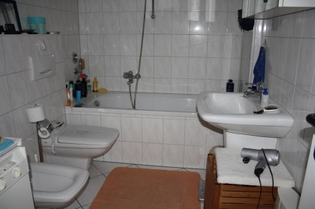 Das freundliche helle Badezimmer ist mit einer Badewanne und Bidet ausgestattet . Es befindet sich wie das Schlafzimmer auf der oberen Ebene der Maisonette.