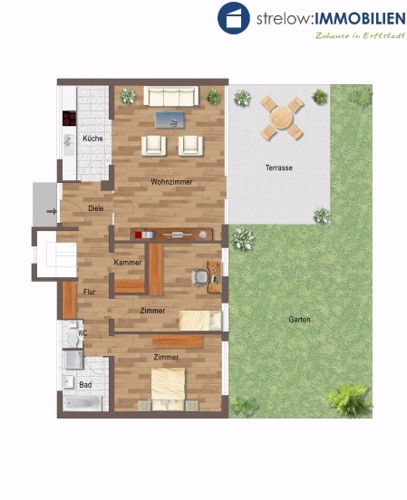 Die ca. 100 m² reine Wohnfläche verteilen sich auf ein geräumiges Wohnzimmer mit offener Küche, Flur, zwei Schlafzimmer ein Bad, ein WC und eine Abstellkammer.