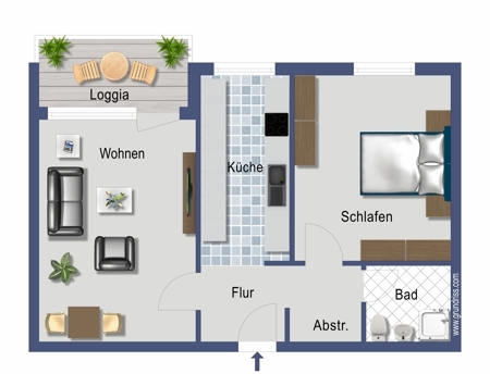 Die 50 m² Wohnfläche verteilen sich auf zwei Zimmer, eine zum Flur offene Küche, sowie Bad und Flur.