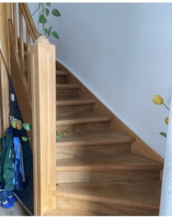 Zunächst betritt man einen kleinen Flur mit Zugang zur Treppe, dem Gäste-WC und der Küche. Hinter der Küche befindet sich der Wohn-Essbereich. Die schön herausgearbeitete Holztreppe führt ins erste OG mit dem großzügigen neuwertigen Bad und dem dahinter liegenden Schlafzimmer. Weiter geht es dann ins Dachgeschoss mit 2 Kinderzimmern.