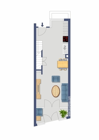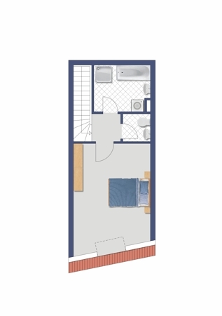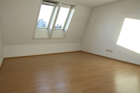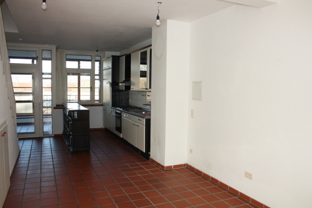 Ein besonderes Architektenhaus beherbergt diese nicht alltägliche Maisonette. Die Wohnung erstreckt sich insgesamt über 73m² im dritten und vierten Obergeschoss. Die Wohnung wird über einen mediterran gestalteten Laubengang erreicht. Ohne einen Flur zu durchqueren steht man direkt mitten drin. Die untere Ebene besteht aus einem großen, lang gezogenen Wohn-/Essbereich mit offener Küche inklusive Einbauküche und einem kleinen Wintergarten. Auf der oberen Ebene befindet sich das großzügige Schlafzimmer mit sehr wenig Dachschräge und jeweils in einem separaten Raum Toilette und Bad.