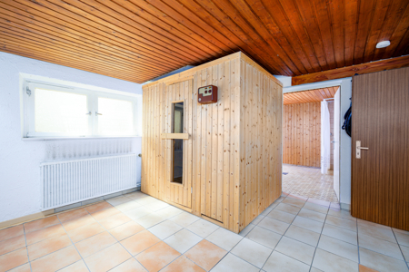 Mit ca. 96 m² Wohnfläche zeigt das Haus über eine klassische Raumaufteilung mit vier Zimmern, Küche, Bad und Gäste-WC, verteilt auf zwei Vollgeschosse. Der voll ausgebaute Keller ist beheizt und beherbergt neben dem Heizungsraum einen Vorratsraum, die Waschküche und einen Sauna-Raum.