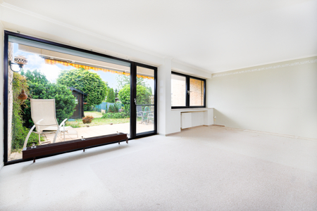 Der Wohn- und Essbereich mit Zugang zur Terrasse bildet im Erdgeschoss das lichtdurchflutete Herzstück des Hauses. Der über Eck verlaufende Raum bietet viel Platz für eine gemütliche Sofalandschaft und einen Esstisch. Weiterhin befindet sich im Erdgeschoss das Gäste-WC und die Küche. Hier ist noch eine alte Einbauküche vorhanden.