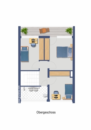 Im Obergeschoss befinden sich das Duschbad, das Schlafzimmer mit Zugang zum überdachten Balkon, sowie zwei weitere Zimmer, die ideal als Kinderzimmer oder Arbeitsräume genutzt werden können.